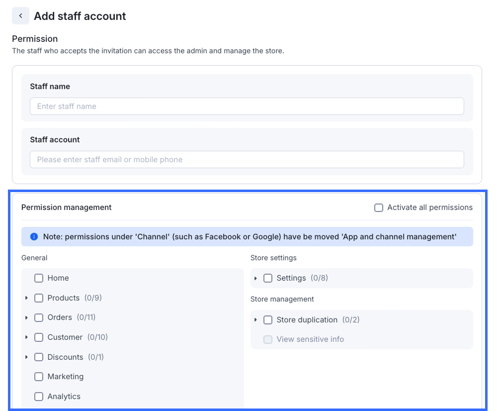 If they will be given access to the Shopline store, ask which permissions they’ll need. People with access to your Shopline store can be granted permissions based on their role.